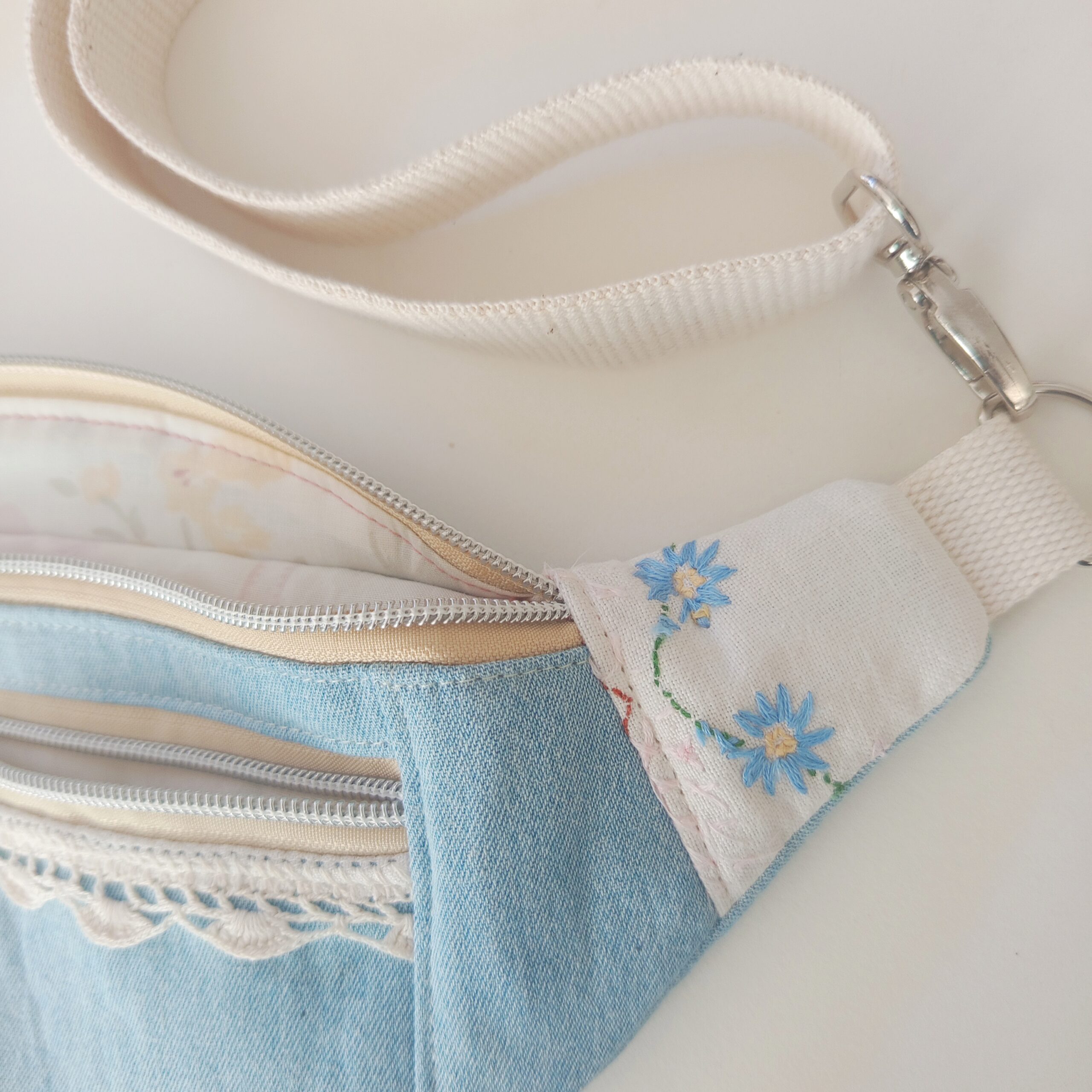 Adjustable cotton webbing strap attached with nickel metal hardware. Minimum strap length/circumference including bag 82cm, maximum 120cm